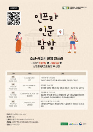 2025.08.21인프라 인문 탐방 <조선~개화기 한양 인프라> 1차 : 9월 19일(금) 10시~12시 조선 상업 인프라 -시전2차 : 9월 26일(금) 10시~12시 한양 도성 냇물을 열다 – 개천3차 : 10월 17일(금) 10시~12시 도심에 들어선 서구식 첫 공원 -탑골공원4차 : 10월 24일(금) 10시~12시 근대 의료 인프라 – 대한의원 모빌리티 인문교양센터에서 주최하는 인문페어 인프라 인문 탐방 <조선~개화기 한양 인프라>가 4회에 […]