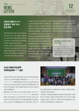 2025.12.23모빌리티인문학 연구원은 교육부와 한국연구재단이 주관한 인문한국플러스(HK+) 지원사업(2018~2025) 종합평가에서 최고 수준인 ‘매우 우수’ 등급을 획득했다. 인문한국플러스(HK+) 사업은 세계적 수준의 인문학 연구소를 육성하고 연구 성과를 사회적·국제적으로 확산시키는 국가 인문학 진흥 프로그램이다. 우리 연구원은 2018년 선정 이후 7년간 ‘모빌리티 인문학’이라는 새로운 학문 분야를 체계적으로 정립하고, 이를 교육과 사회 확산으로 이어가며 국내외 인문학 연구의 새로운 흐름을 선도해 왔다. 평가단은 […]