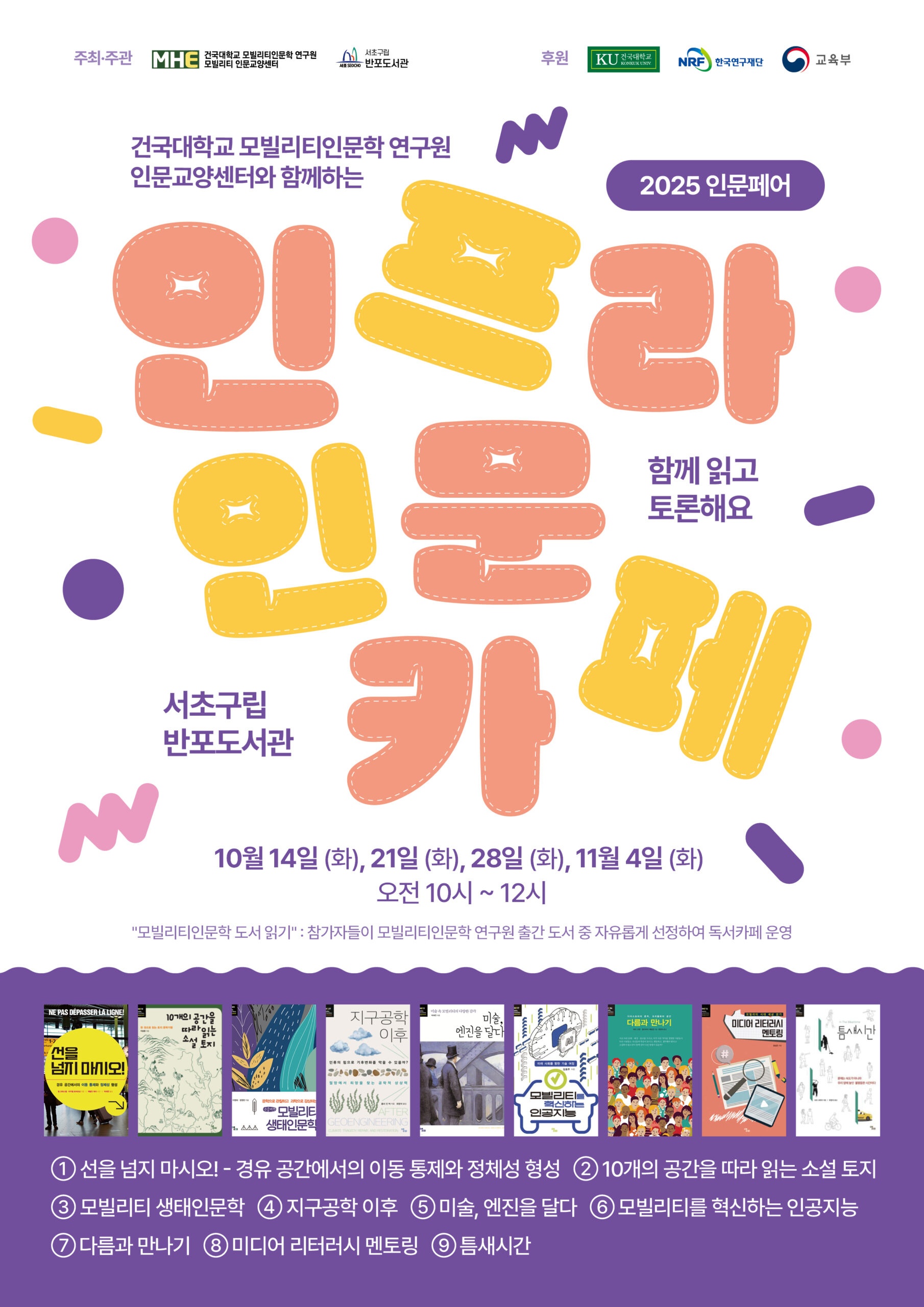 - 인프라 인문카페- 인문교양센터는 서초구립반포도서관과 함께 <인프라 인문카페> 를 개최합니다. - 10월 14일(화), 21일(화), 28일(화), 11월 4일(화) 총 4회에 걸쳐 모빌리티인문학 도서를 함께 읽고 토론합니다. - 10월 14일(화)에는 《다름과 만나기 - 디아스포라의 흔적, 크리올화의 공간》의 역자 최영석(연세대학교 현대문학 박사) 강연이 있습니다. - ✔️시간: 10월 14일(화) 오전 10시~