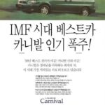 | 1186 | 카니발 | 기아자동차(Kia motors) | 1998-04-06 | 매일경제 | IMF 시대 베스트카 카니발 인기 폭주! | ![]() |