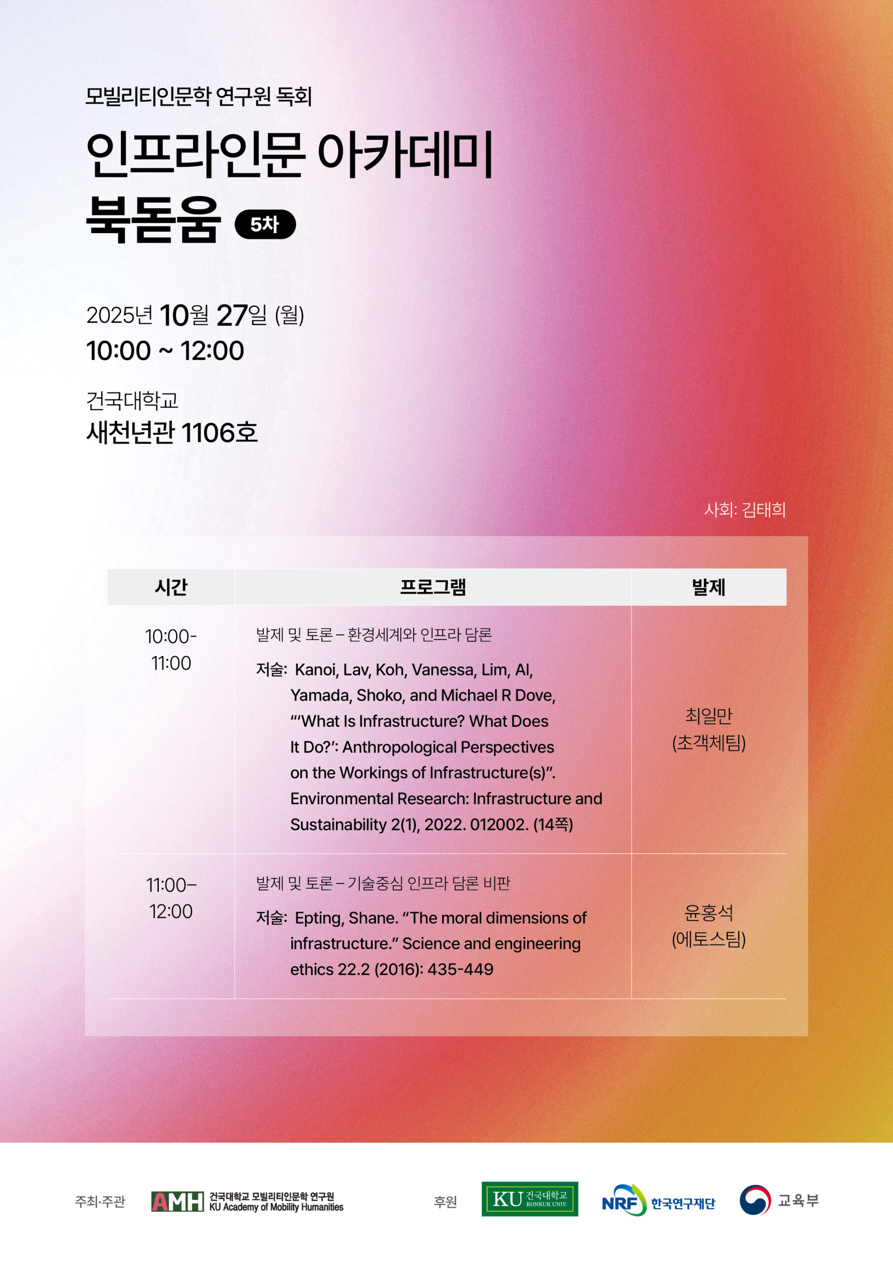 인프라에 관한 인문학·사회과학의 주요 저술 학습을 통하여, 인프라 인문학 연구의 이론적 토대를 구축한다.